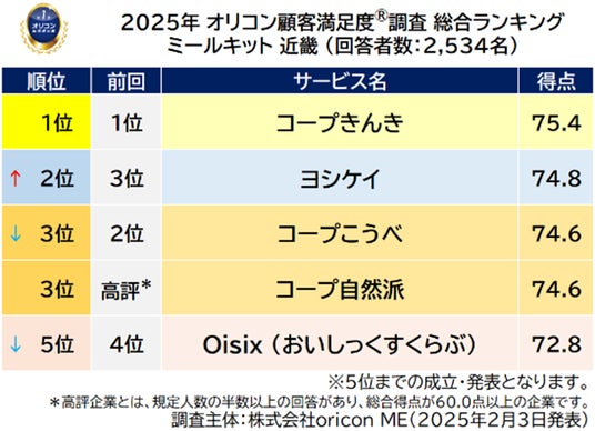 『ミールキット 近畿』総合ランキング_前回順位付き(2025年 オリコン顧客満足度(R)調査)