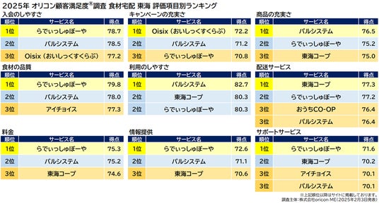 『食材宅配 東海』評価項目別ランキング(2025年 オリコン顧客満足度(R)調査)