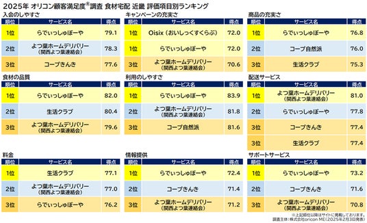 『食材宅配 近畿』評価項目別ランキング(2025年 オリコン顧客満足度(R)調査)