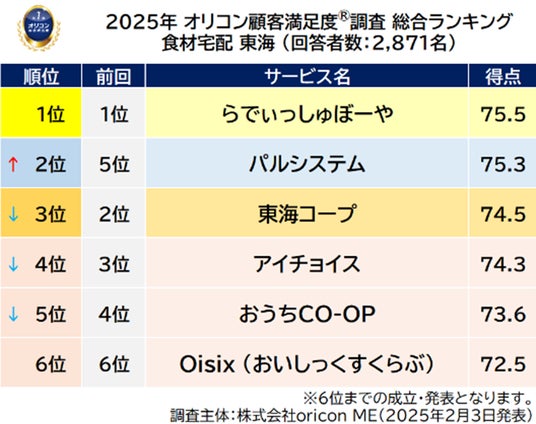 『食材宅配 東海』総合ランキング_前回順位付き(2025年 オリコン顧客満足度(R)調査)