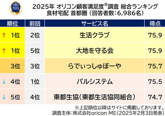 満足度の高い『食材宅配』ランキング『首都圏』では【生活クラブ】と【大地を守る会】が同点総合1位【生活クラブ】は8度目の総合1位 【大地を守る会】は前回5位から総合1位に(オリコン顧客満足度調査)