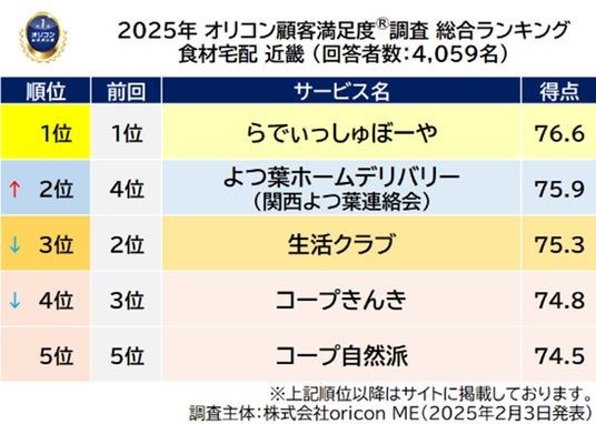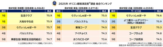 『食材宅配 近畿』部門別ランキング(2025年 オリコン顧客満足度(R)調査)