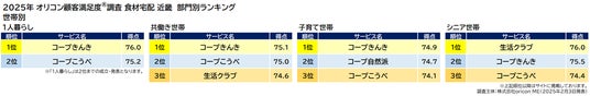 つづいて総合3位には【東海コープ】がランクイン。評価項目別「配送サービス」で1位、世帯別「シニア世帯」で1位を獲得しています。