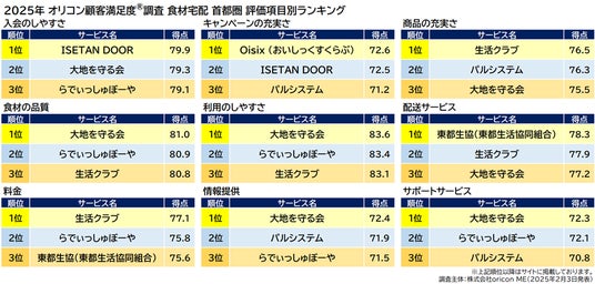『食材宅配 首都圏』評価項目別ランキング(2025年 オリコン顧客満足度(R)調査)