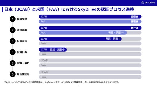 「空飛ぶクルマ」(※1)の開発およびドローン関連サービスを提供する株式会社SkyDrive(本社:愛知県豊田市、代表取締役CEO 福澤知浩、以下「当社」)は、空飛ぶクルマ「SKYDRIVE(SkyDrive式SD-05型)」の型式証明(※2)活動において、国土交通省航空局(以下「航空局」)から適用基準を発行されたことをお知らせいたします。本基準の発行で、当社の空飛ぶクルマ固有の耐空性および環境基準の詳細がおおむね固まったため、今後の開発がさらに加速していきます。