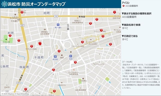 AED設置箇所や緊急避難場所などの浜松市の防災関係のオープンデータを地図上で可視化