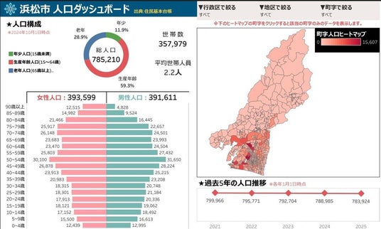住民基本台帳のデータに基づき、浜松市の人口の現状を見える化したダッシュボード