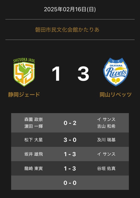 ノジマTリーグ 2024-2025シーズン 公式戦 2月16日開催 静岡ジェード vs 岡山リベッツの試合は1-3で岡山リベッツが勝利しました。