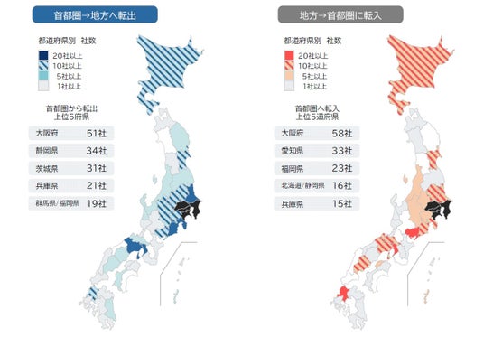 地方から首都圏へ移転した転入元では、「大阪府」(58社)、「愛知県」(33社)、「福岡県」(23社)で多く、主に西日本地域からの移転が多い。