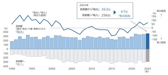 2024年に首都圏から地方へ本社を移転(転出)した企業は、年間で363社に上った。23年(347社)に比べて16社・4.6%の増加となったほか、1990年以降で最多を更新した。また、1990年以降で初めて4年連続で年間300社を超え、首都圏から地方へと本社を移転する流れが続いた。
