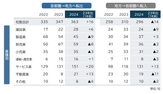 帝国データバンクは、2024年に首都圏(東京・神奈川・千葉・埼玉:1都3県)⇔地方間をまたいだ「本社所在地の移転」が判明した企業(個人事業主、非営利法人等含む)について、保有する企業概要データベースのうち業種や規模が判明している企業を対象に分析を行った