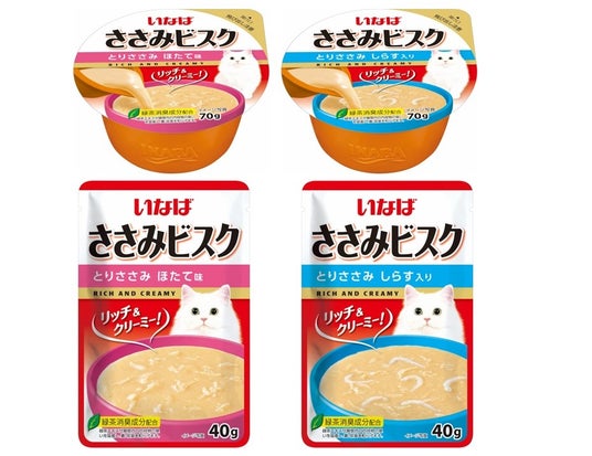 いなば食品株式会社なめらかで濃厚なスープタイプの猫ちゃん用「ささみビスク」、カップとパウチが登場!