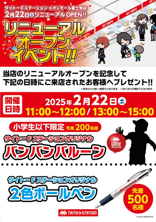 株式会社タイトー(本社:東京都新宿区、代表取締役社長:岩木 克彦、以下タイトー)が展開するアミューズメント施設「タイトーステーション」のフランチャイズパッケージ加盟店「タイトーFステーション イオン富士宮店」(静岡県富士宮市 )が、2月22日(土)にリニューアルオープンいたします。