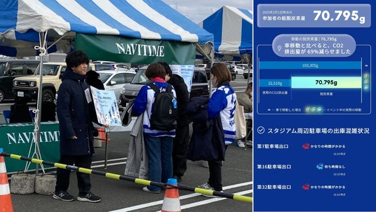これまでの実証実験の模様(会場PRブースと、脱炭素への貢献度/ヤマハスタジアム駐車場の混雑状況を表示した「moveco」アプリ内レヴズモード画面)