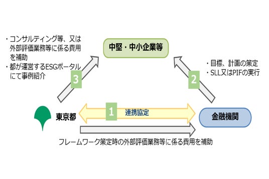 金融機関と連携協定を締結し、サステナビリティ・リンク・ローン(SLL)【注2】やポジティブ・インパクト・ファイナンス(PIF)【注3】等の活用を通じて、中堅・中小企業の経営をサステナビリティに配慮したものへと転換を促す事業。東京都は、中堅・中小企業が連携金融機関からSLLまたはPIF等で資金調達をする際に必要となる各種コンサルティング業務や外部評価に係る費用の一部を支援している。