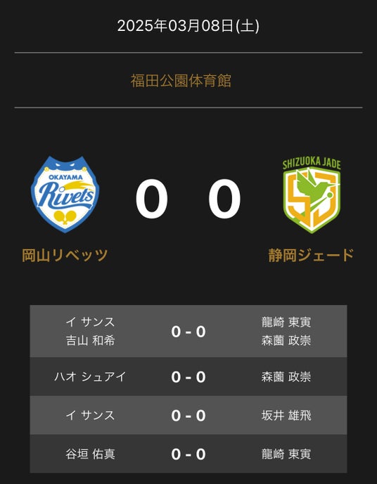 ノジマTリーグ 2024-2025シーズン 公式戦 3月8日開催 岡山リベッツ vs 静岡ジェード 対戦オーダー発表
