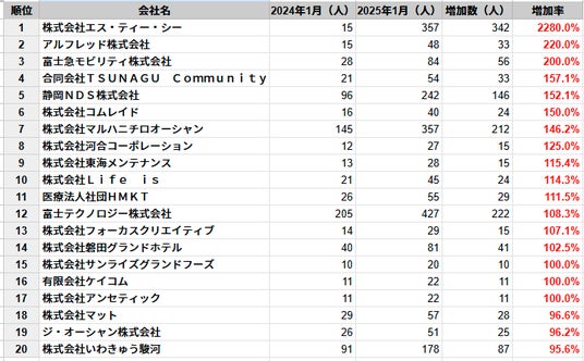 「誰もが活躍できる仕組みをつくる。」をミッションに掲げ、セールスチームの武器となるデータベース「SalesNow」を展開する株式会社SalesNow(本社:東京都渋谷区、代表取締役:村岡功規、以下「SalesNow」)は、国内550万社の企業情報を完全網羅した日本最大級のデータベース「SalesNow DB」より、静岡県に本社を置く企業の2024年1月時点および2025年1月時点の従業員数データを分析し、従業員数増加率ランキングTOP20を発表しました。本ランキングは、各企業の成長スピードを可視化するものであり、新規雇用の創出や事業拡大の動向を明らかにしています。