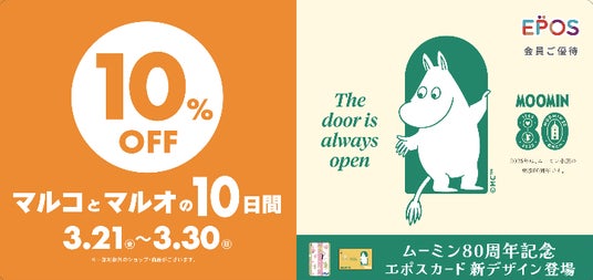 株式会社丸井(本社:東京都中野区、取締役社長:青野 真博)は、2025年3月21日(金)~3月30日(日)の10日間、マルイ・モディ全店およびマルイのネット通販「マルイウェブチャネル」にて、エポスカード会員ご優待キャンペーン『マルコとマルオの10日間』を開催いたします。期間中、エポスカードのクレジットでのお支払いで、10%OFFにてお買物いただけます。また、今回の『マルコとマルオの10日間』は、「ムーミン小説版」発売80周年を記念してコラボレーション企画を実施いたします。