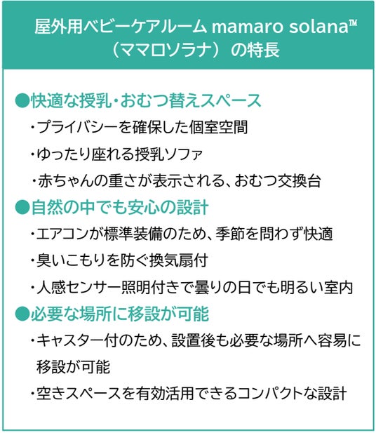 当社は「快適で安全な環境を創造する」理念のもと、今後も赤ちゃんとそのご家族が、より快適に過ごせる環境づくりを目指し、全国の観光地や公園、商業施設などへmamaro solana(TM)(ママロソラナ)の展開を積極的に進めてまいります。