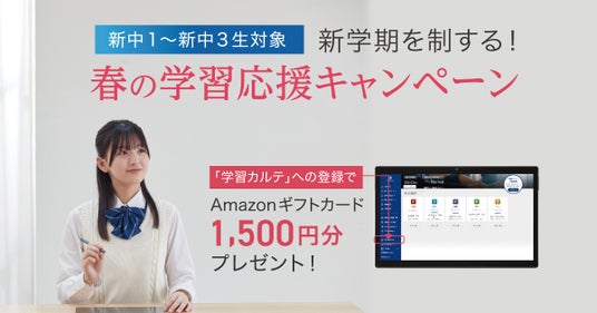 入会後に学習アプリ内の新機能「学習カルテ」に登録いただいた方に、Amazonギフトカード1,500円分をプレゼント。“春から新しい学習を始めるあなた”を応援します。