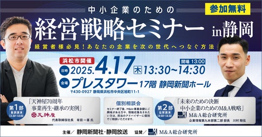 M&A総合研究所株式会社M&A総合研究所(本社:東京都千代田区、代表取締役社長:佐上 峻作、以下「当社」)は、2025年4月17日(木)に静岡県浜松市でM&A・事業承継に関するセミナーを開催いたします。