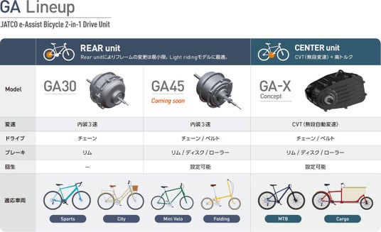 また今回、昨年発表したこのドライブユニット(GA30)の次期型となるGA45と、変速機構にCVTを採用したコンセプトモデル(GA-X Concept)を公表、ドライブユニットの搭載位置やカバーする自転車のタイプの選択肢を広げることでビジネス領域の拡大を図ります。