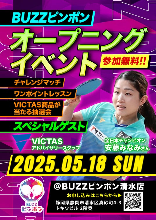 静岡・清水に誕生した格安卓球スタジオ「BUZZピンポン 清水店」にて、2025年全日本卓球選手権大会・混合ダブルス優勝の安藤みなみ選手をスペシャルゲストに迎えたオープニングイベントを開催いたします。