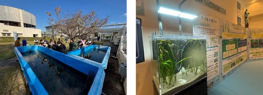 説に基づき、浜名湖体験施設ウォットや地元の学校や企業と共同で、強いDNAをもったアマモ苗を巨大水槽で育てる栽培を開始しました。この仮説や実験の様子は、地元の複合商業施設イオンモール浜松市野でも展示イベントを約2ヶ月間実施した他、地元企業がこの水槽実験を継続的に支援できる体制として協賛看板の設置を行いました。