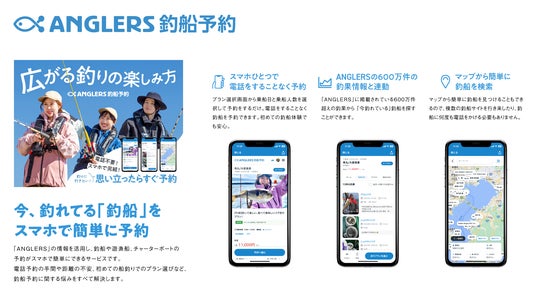 釣り専用SNS「ANGLERS(アングラーズ)」の情報を活用し、釣船や遊漁船、チャーターボートの予約がスマホで簡単にできるサービスです。釣り専用SNS「ANGLERS」は17秒に1回釣果が投稿される釣り専用のSNSです。月間100万人以上のユーザーが訪れ、釣果情報の投稿や、釣り情報のコミュニケーションの場として活用されています。