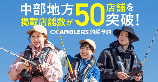 スマートフォンで簡単に釣船予約ができるサービス『アングラーズ釣船予約』を運営する株式会社アングラーズ(本社:東京都町田市、代表取締役:若槻嘉亮)は、中部地方(愛知県、静岡県、三重県など)における掲載店舗数が50店舗を突破したことをお知らせします。これはサービス開始当初と比較し2.5倍の伸長であり、新サービスであるアングラーズ釣船予約が順調に地域へ浸透し、釣り人と釣船側、双方から高く支持されていると受け止めています。