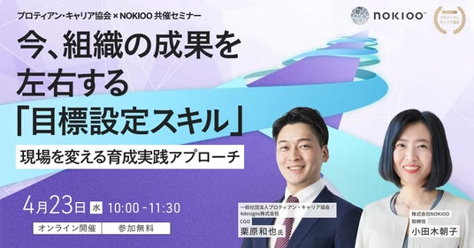 一般社団法人プロティアン・キャリア協会(東京都新宿区、代表理事:田中研之輔・有山徹、以下「当協会」)は、株式会社NOKIOO(所在地:静岡県浜松市、代表取締役:小川健三)と共催で、2025年4月23日(水)10:00よりオンラインセミナー「今、組織の成果を左右する『目標設定スキル』~現場を変える育成実践アプローチ~」を開催します。