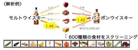 市販のウイスキーと600種類の食材を解析した結果、本試験に使用したモルトウイスキーはチェダーチーズと、バーボンウイスキーはエビと相性が良いことがわかりました。このように、風味の違いから、相性の良い食材を見つけることができました。