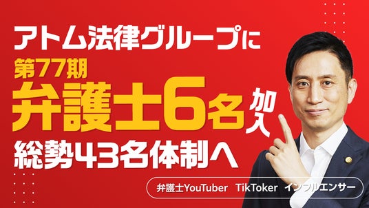 アトム法律事務所弁護士法人(本社:東京都千代田区、代表弁護士:岡野武志)は、2025年4月、第77期の弁護士6名を新たに迎え入れ、全国15事務所体制のグループ全体での弁護士数が43名に達しました(グループ全体のスタッフ数は150名超)。