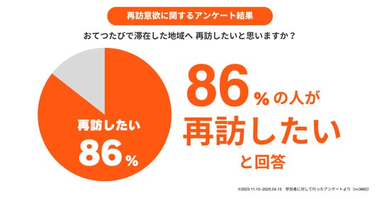 参加者へのアンケート結果によれば、80%の方が「おてつたびがなければ訪れる予定はなかった」と回答し、そのうち49%は「滞在地域について知らなかった」と回答。さらに、「いずれ滞在地域を再訪したい」と回答した人は86%に上りました。