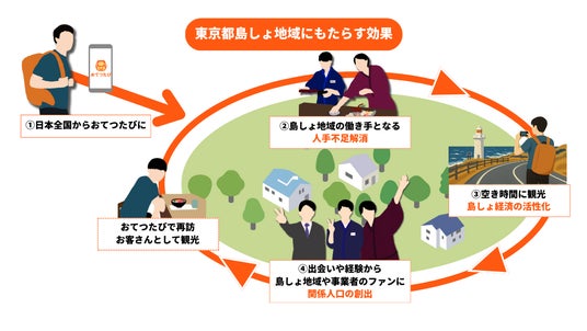 短期間かつ人手が必要な繁忙期に合わせてピンポイントで人材確保ができるほか、島外からの就労者が東京都島しょ地域のファンやお客様に変化することで、関係人口の創出や広告効果等も期待できます。