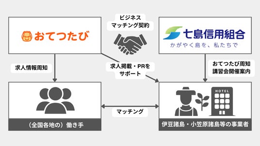 人手不足で困っている地域と地域で働きたい旅人をつなぐ人材マッチングサイト『おてつたび』を運営する株式会社おてつたび(本社:東京都渋谷区、代表取締役:永岡里菜、以下「おてつたび」)は、2025年4月15日より七島信用組合(所在地:東京都大島町、理事長:鈴木孝信)と顧客紹介業務に関する提携契約を締結いたします。この協業により、東京都島しょ地域の人手不足解消と関係人口創出に向けて共同で取り組んでまいります。