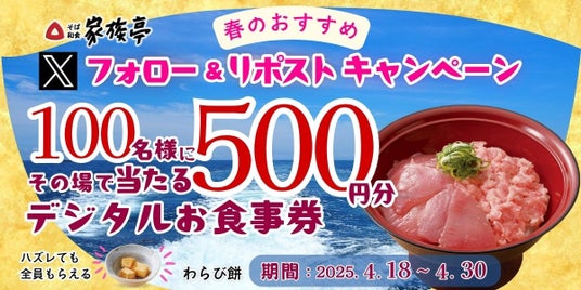 株式会社家族亭(本社・大阪府大阪市、代表取締役社長・坪山 憲司)が運営するそば和食チェーン「家族亭」は、2025年4月18日(金)午後8時~4月30日(水)の期間に、家族亭公式Xで「家族亭デジタルお食事券 500円分」が抽選で100名様に当たる家族亭公式Xフォロー&リポストキャンペーンを開催いたします。家族亭の公式Xをフォローし、キャンペーンポストをリポストすることで参加ができ、当たりがその場ですぐに分かります。デジタルお食事券の抽選に惜しくも外れた方も、「わらび餅サービスクーポン」がもらえるとてもお得なキャンペーンです。ぜひこの機会にキャンペーンにご参加ください。