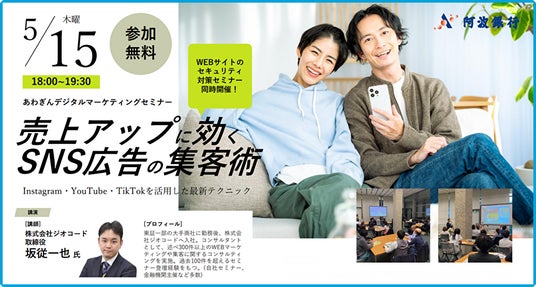 Webマーケティングとクラウドセールステック事業を展開する株式会社ジオコード(本社:東京都新宿区、代表取締役:原口 大輔、証券コード:7357)は、5月15日(木)に株式会社阿波銀行が主催するセミナーで、取締役の坂従一也が、「売上アップに効くSNS広告の集客術」と題して登壇・講演することをお知らせします。また、同時開催で「Webサイトセキュリティ対策セミナー」も実施いたします。