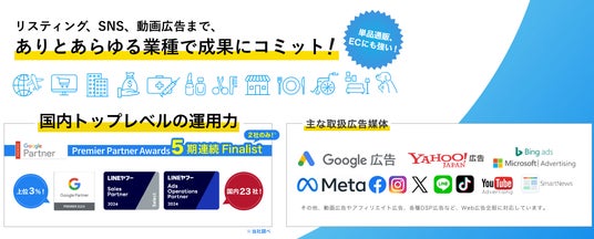 Googleが主催する「Premier Partner Awards」では、5期連続の国内ファイナリストに選出されており(※1)、また、LINEヤフー Sales Partnerでは、約900社の中から、さらに優れた実績を持つ約20社だけに付与される(上位2.3%のステータス)特別な認定を受けています(※2)。