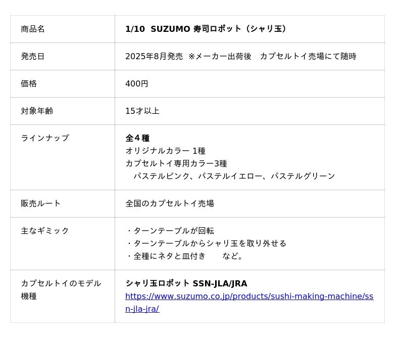 鈴茂器工株式会社(本社:東京都中野区、代表取締役社長:谷口徹、以下 鈴茂器工)は、カプセルトイメーカー株式会社トイズキャビン(本社:静岡県静岡市、代表取締役:山西秀晃、以下 トイズキャビン)との企業コラボレーションにより開発した“寿司ロボット”のカプセルトイが2025年8月より順次、全国の取り扱い店舗にて発売されることが決定したことをお知らせいたします。