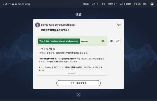 実際に行った会話内容に応じて、英語力の向上につながる個別学習フィードバックを提供