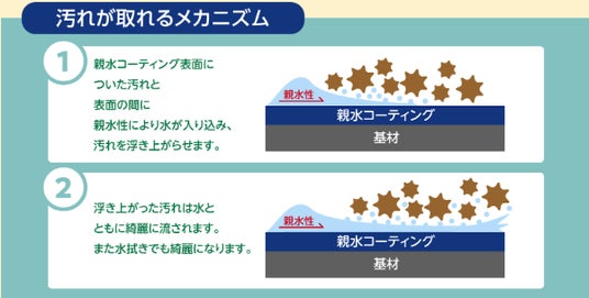 1. わずかな水で油汚れが落ちるKIRAコート※2(超親水コーティング)。水量は大幅低減!お手入れ簡単&衛生面◎