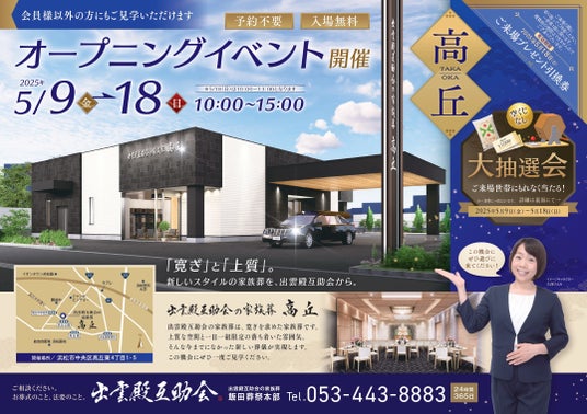 株式会社出雲殿互助会株式会社出雲殿互助会(所在地:浜松市中央区連尺町、代表取締役:岸本裕一郎)は、2025年5月20日(火)、新たな家族葬ホール「出雲殿互助会の家族葬 高丘」をオープンいたします。