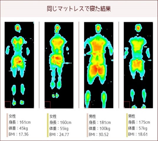 確かに、身体の大きなお相撲さん、がっしり体型のアスリート、スリムなモデルさんや小柄なお年寄りが同じマットに寝たときの体圧分散性が同じなるだろうか。