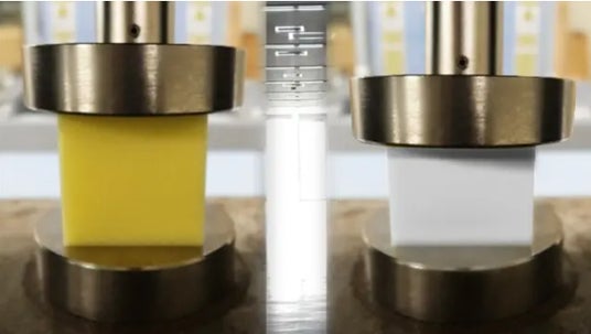 本設計技術のポイントの1つ目は、設計指標となる低反発ウレタンフォームと高弾性ウレタンフォームの厚さを1mmから99mmの範囲で変化させ積層した50mm角のブロックの弾性データを、それぞれの弾性データを基に作成したことです。
