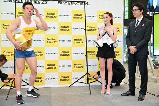 また御殿場プレミアム・アウトレットの思い出について聞かれたNikiさんは「運転免許を取って大学の友達と御殿場プレミアム・アウトレットに行ったのが思い出。天気も良くて写真映えもいい。たとえ買い物がなくても良いものに出会えるワクワク感がある。その時も良い出会いがあって、素敵な思い出として残っています」と懐かしそう。一方、なかやまきんに君さんは「2年前に御殿場プレミアム・アウトレットに父と一緒に行って、父の日のプレゼントを買った思い出があります。その時に良いギャグを頂きました」と親孝行な一面を明かして、その時に閃いたというギャグ「パパー!」を生披露した。そのトーンが持ちギャグ「パワー!」にあまりにも酷似していた為、会場がザワザワすると「新ネタをおろすので緊張はあったけれど、相当ウケた。父親に報告します」と御本人のみ手応えを得ていました。