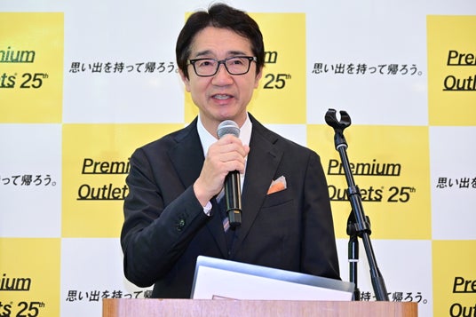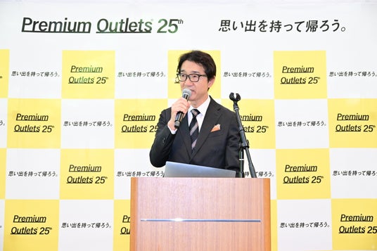 イベントの冒頭には、三菱地所・サイモン株式会社の代表取締役社長 山岸が登壇。2000年に御殿場プレミアム・アウトレットが開業してから25年、日本全国10か所に展開してきた軌跡を振り返りながら、ブランドの歩みと今後の展望について、「日本上陸25周年というこの節目に、ルーツであるアメリカ発祥のDNAと、日本で25年間積み上げた我々の進化を見つめ直した際に、今我々が強く思うことは、「プレミアム・アウトレットがお客様にとって価値ある『時間』を提供する存在でありたい」という想いです。プレミアム・アウトレットは、単なるショッピングの場をご提供する施設に留まりません。アウトレットに行こうと思い立った瞬間からのワクワクする気持ちや、帰宅後に振り返る思い出、そういった前後にあるすべての時間を含めて、私たちは記憶に残る時間を作り、お客様の人生における特別な買い物体験をご提供することを目指しております」と語り、ブランドの進化と新たな挑戦への意欲を示しました。