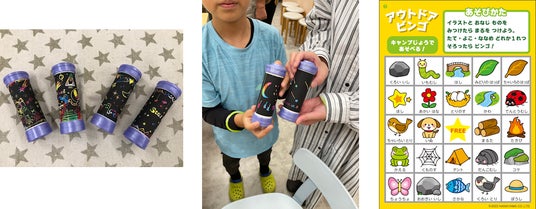 「アウトドアビンゴ」では、双眼鏡を使ってフィールドを散策しながら、ビンゴカードに描かれた植物や動物、昆虫などを見つけてビンゴを目指します。