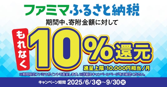 期間中、ファミマふるさと納税で寄附のお申込みをいただくと、もれなく寄附金額に対して10%相当のファミマポイント(進呈上限:10,000円/月)を進呈します。