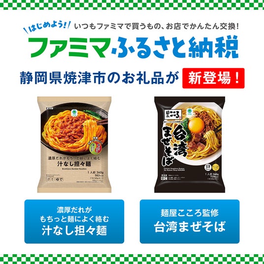 株式会社ファミリーマート株式会社ファミリーマート(本社:東京都港区、代表取締役社長:細見研介)は、継続して取り組んでいる5つのキーワードの「たのしいおトク」「『あなた』のうれしい」の一環として、「お礼品がすぐに全国の店舗で引換可能」な「ファミマふるさと納税」に、新たに「静岡県焼津市」が参画し、冷凍麺2商品を2025年6月12日(木)10時から追加いたします。